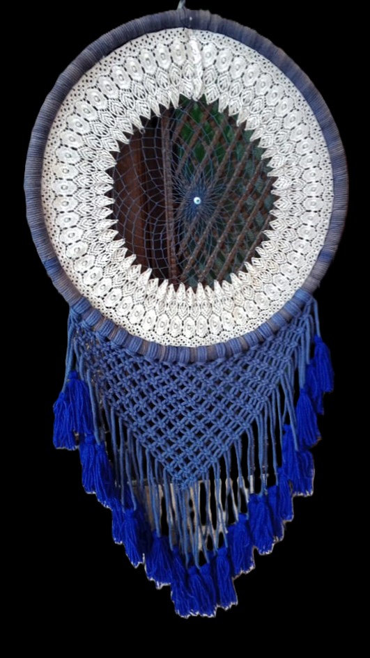 Handcrafted with detailed white weaving and rich navy blue macramé tassels.