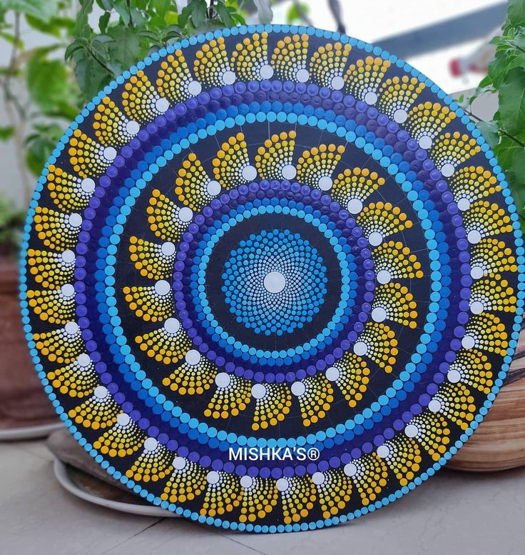 A premium hand-painted dotted mandala art board in elegant yellow and Blue tones, perfect for wall décor, meditation spaces, and artistic interiors.