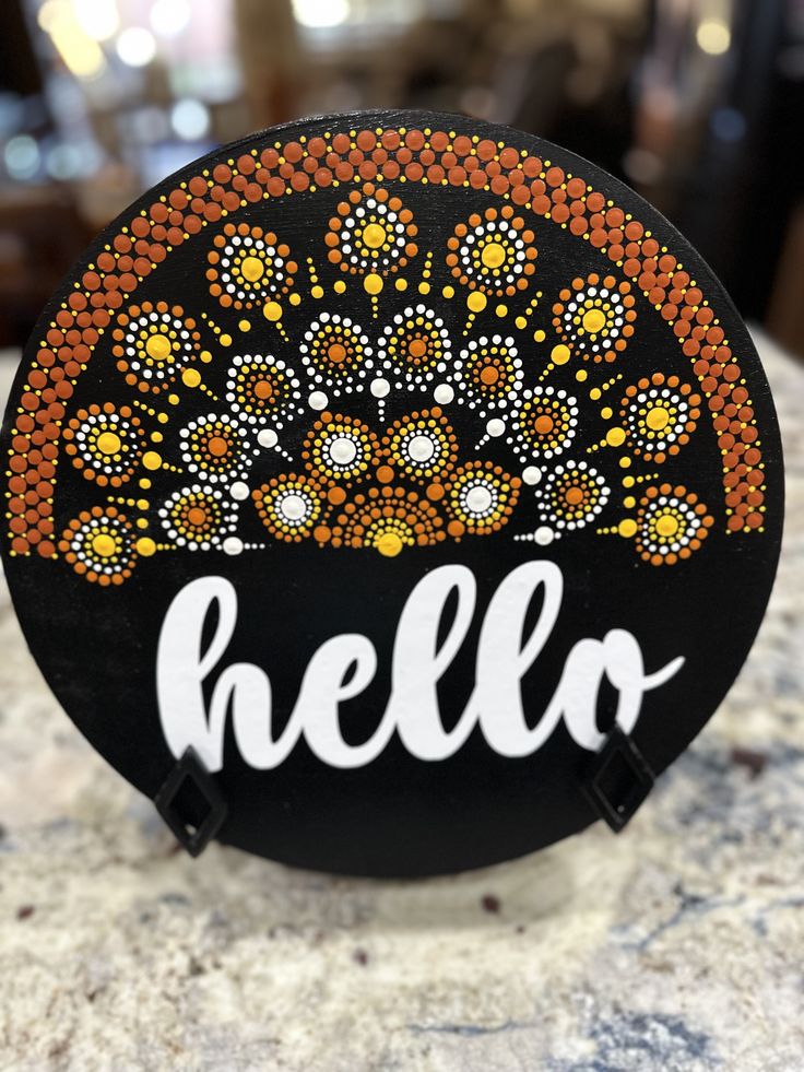 Bring warmth and elegance to your home with this Handcrafted Dotted Mandala Art Hello Board by Angel Hoop Arts.