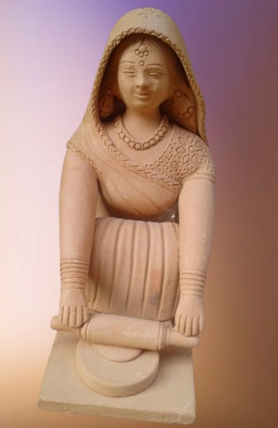 A handcrafted terracotta sculpture depicting a traditional Indian village woman rolling roti with chakla–belan.