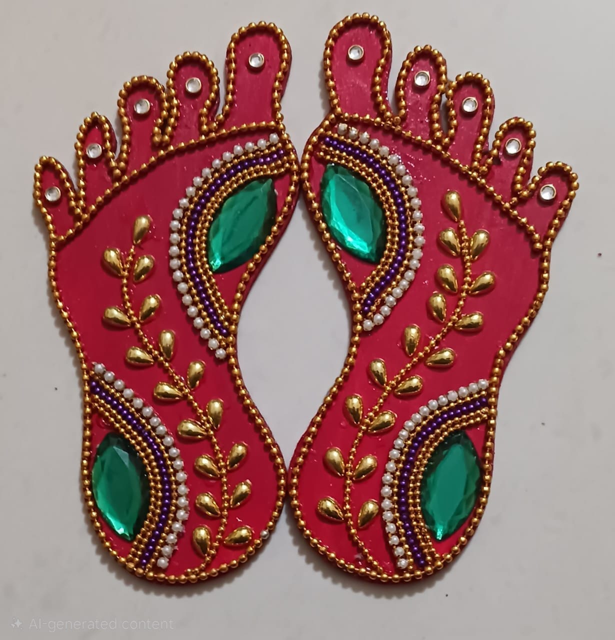 The vibrant red base represents auspiciousness, while the green stones, pearl beads, and golden accents add a rich and divine look. Traditionally placed at the entrance of homes, pooja rooms, temples, or near lockers and cash areas, Lakshmi Charan Paduka is believed to invite wealth, positivity, and good fortune.