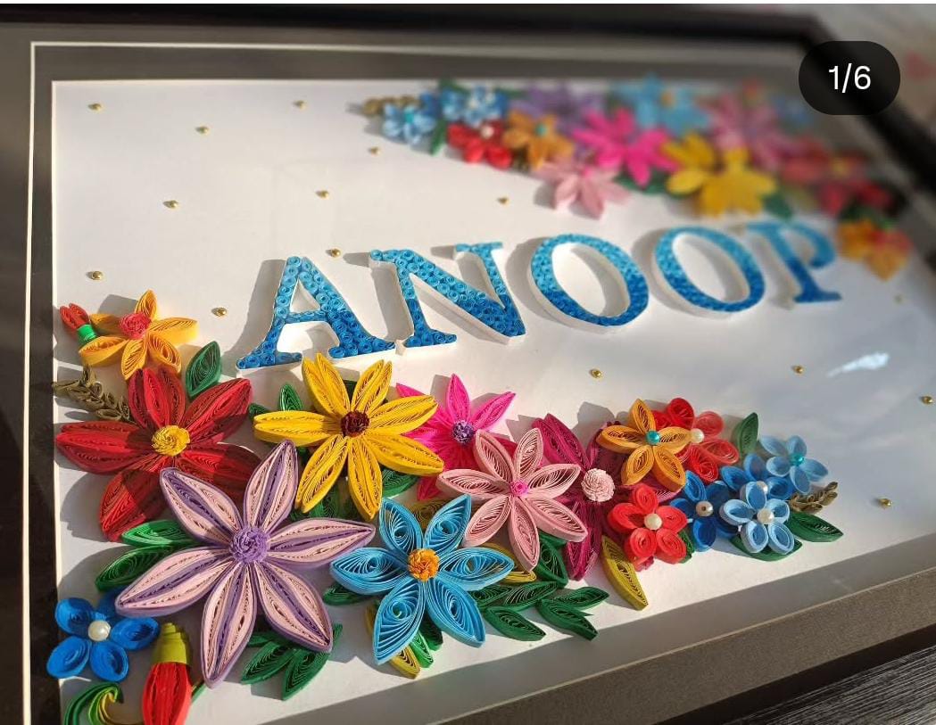 Beautiful handmade paper quilling name frame with colorful floral design. Customizable with name and color theme, perfect for gifting and home décor.