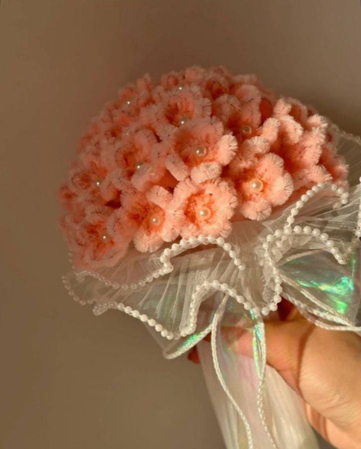 Add a touch of charm and creativity to your gifting with this Handmade Pipe Cleaners Lily Bouquet (Small Flowers). Carefully crafted using soft pipe cleaners, this bouquet features delicate lily-style flowers enhanced with elegant pearl detailing and wrapped in decorative net fabric.