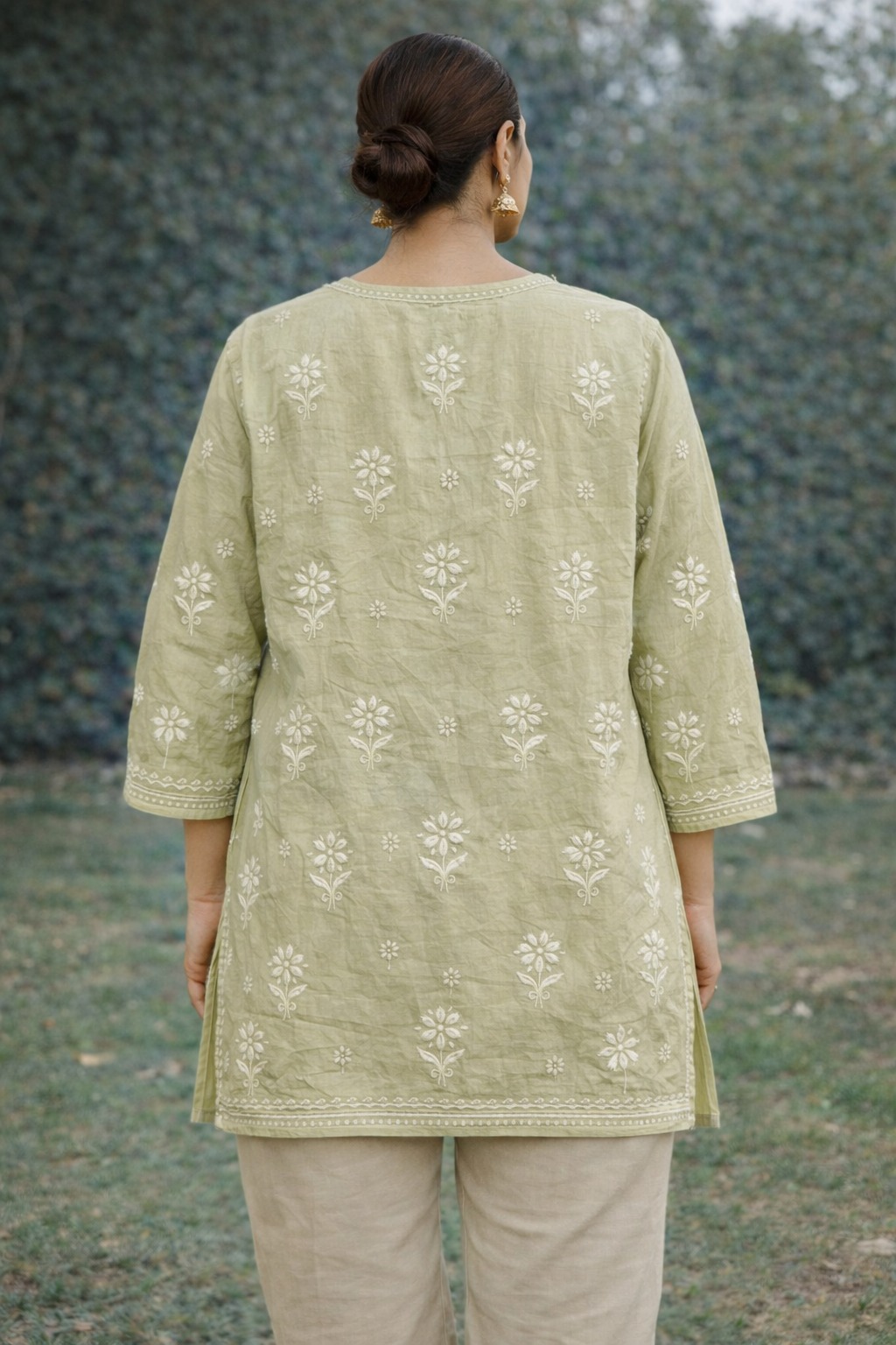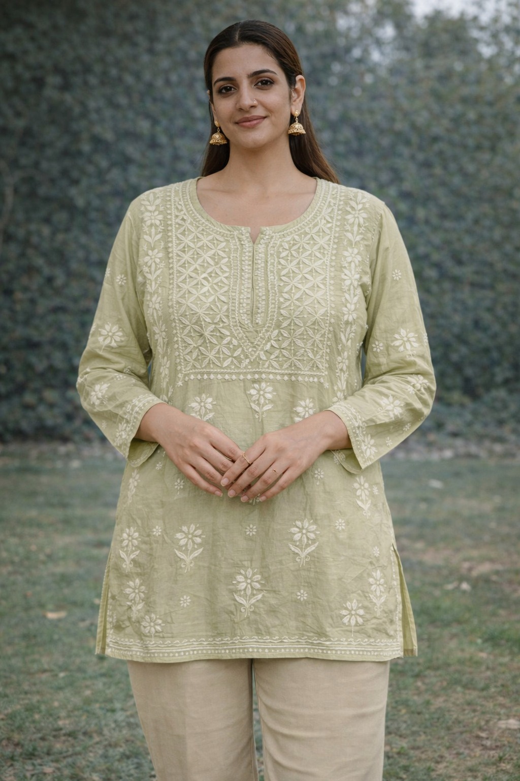 Soft Pastel Green Chikankari Masline top with elegant hand embroidery, paired with comfortable pants. Perfect for daily wear, office, and casual ethnic looks.