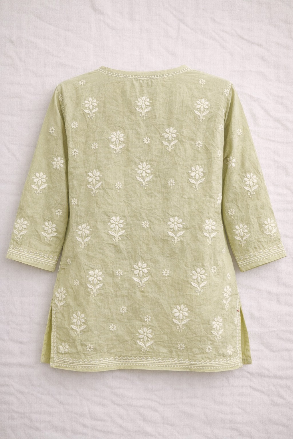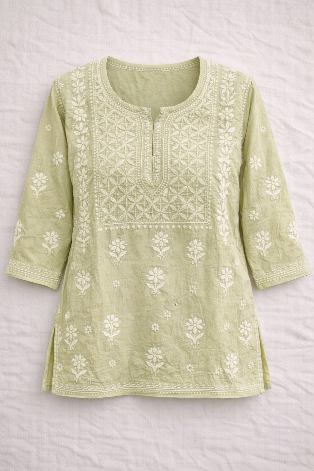 Add grace and comfort to your everyday ethnic collection with this Pastel Green Chikankari Masline Top from AARKAY CHIKAN HANDICRAFT.