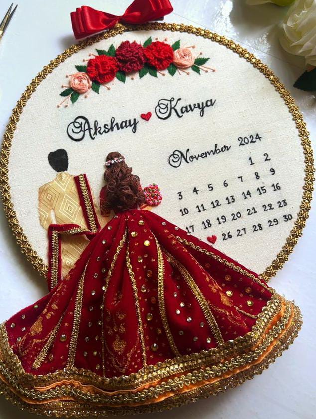 The hoop includes custom embroidered names and a personalized calendar, highlighting a special date with a heart—making it ideal for weddings, engagements, anniversaries, or proposal gifts.