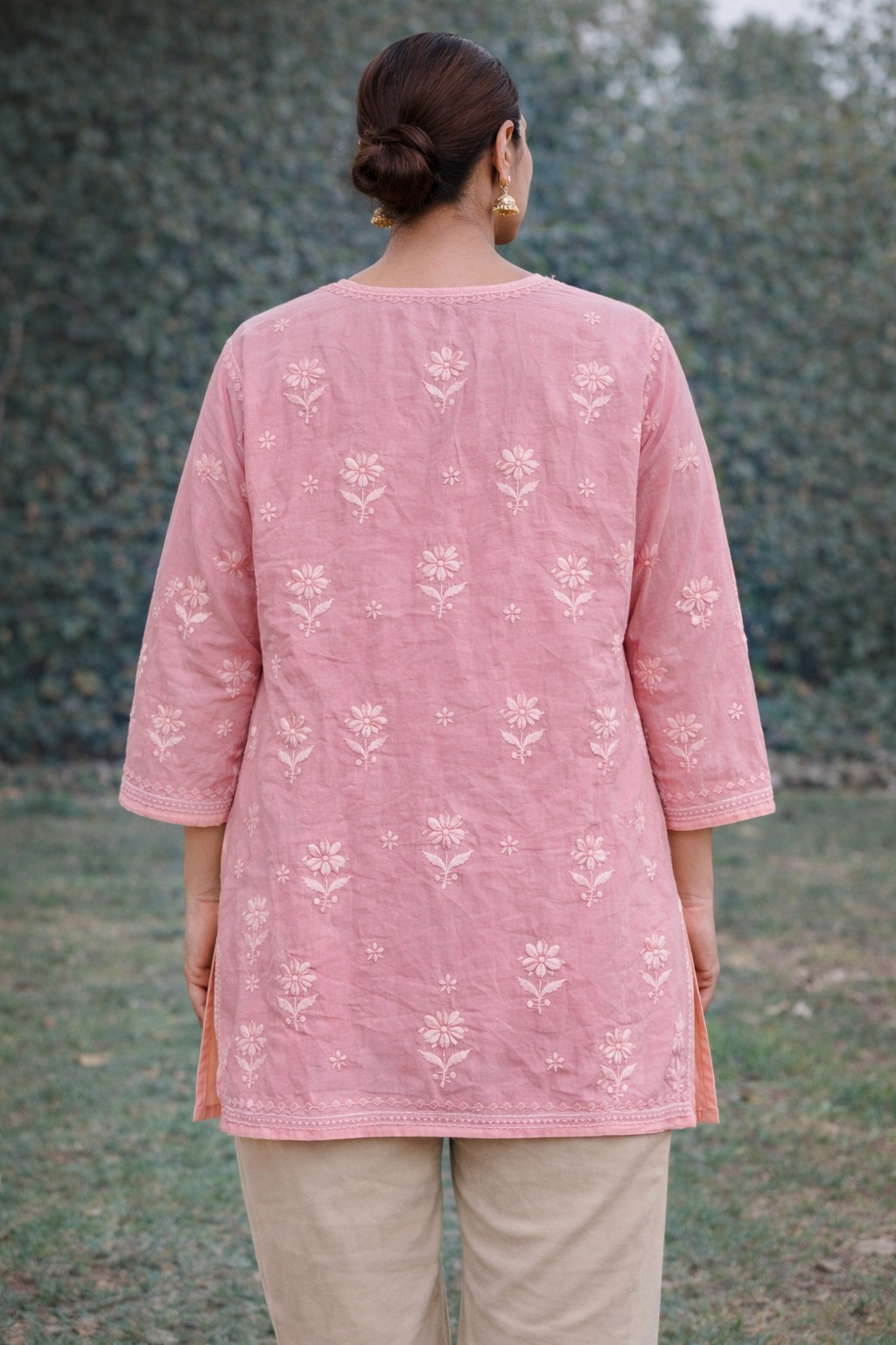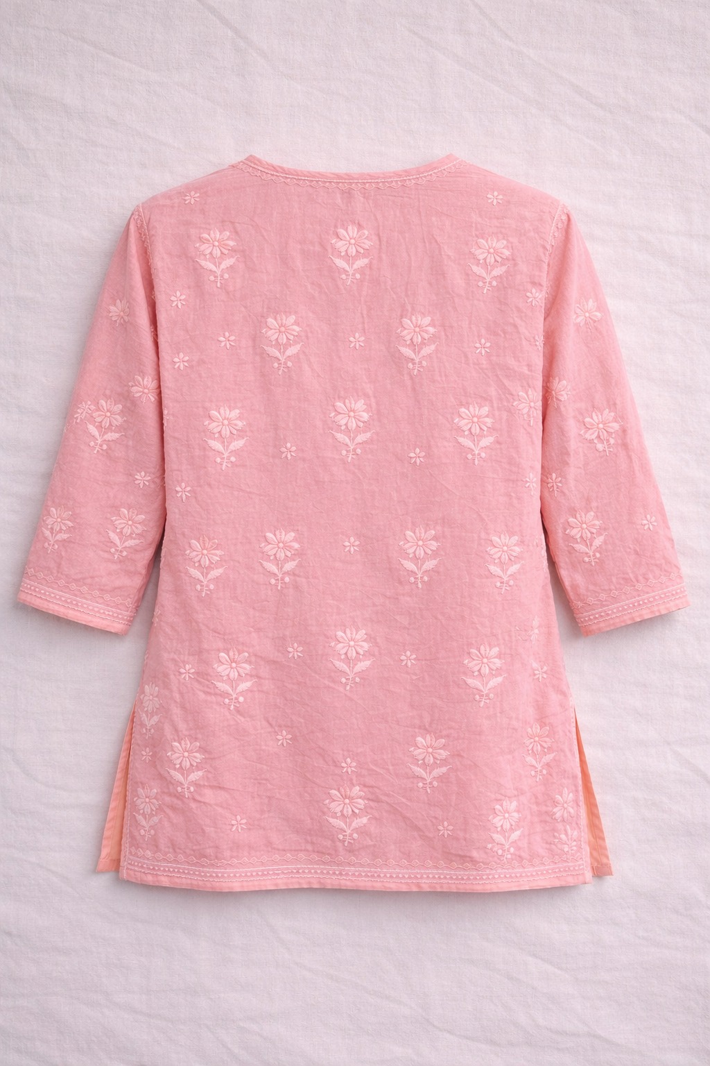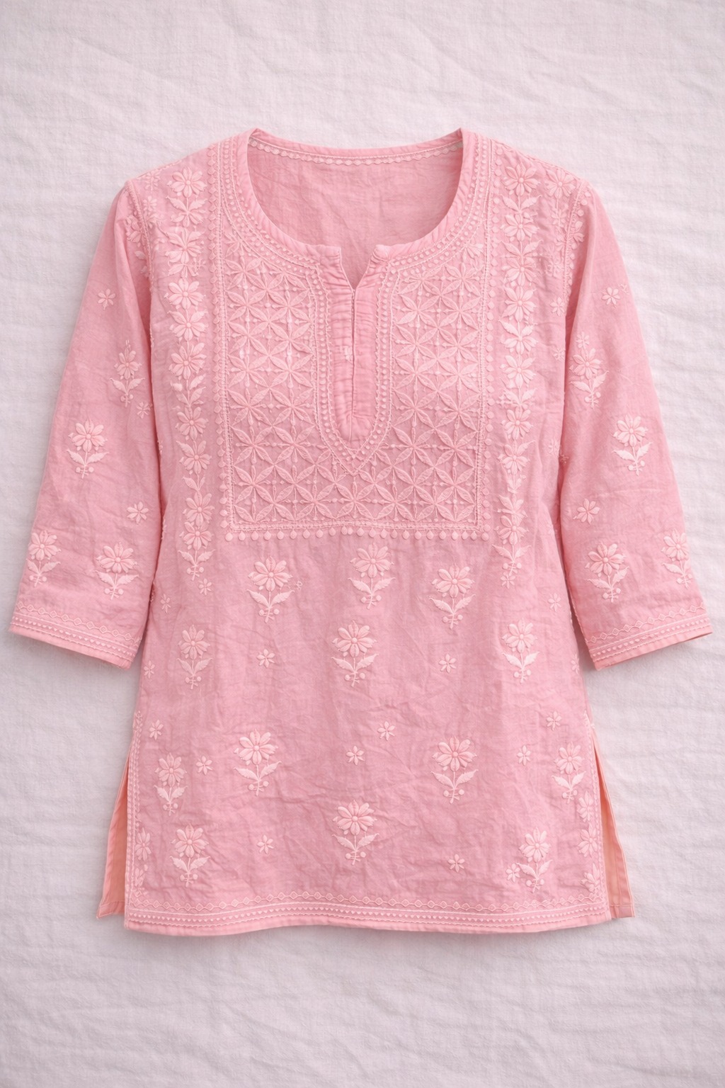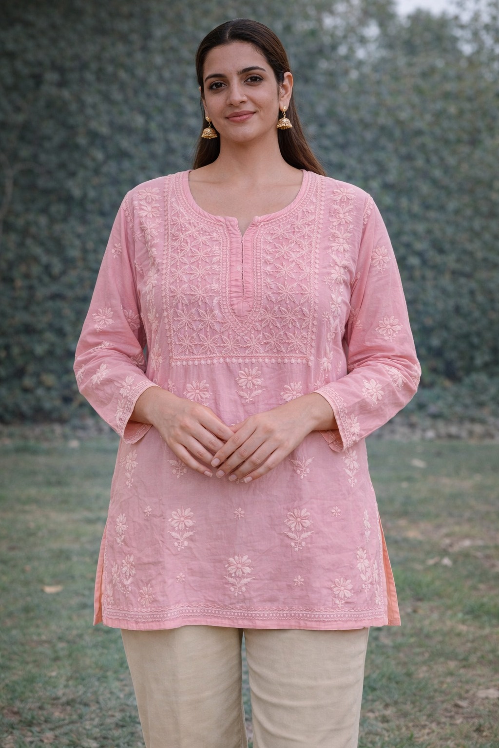 Add grace and comfort to your everyday ethnic collection with this Pink Chikankari Masline Top from AARKAY CHIKAN HANDICRAFT.