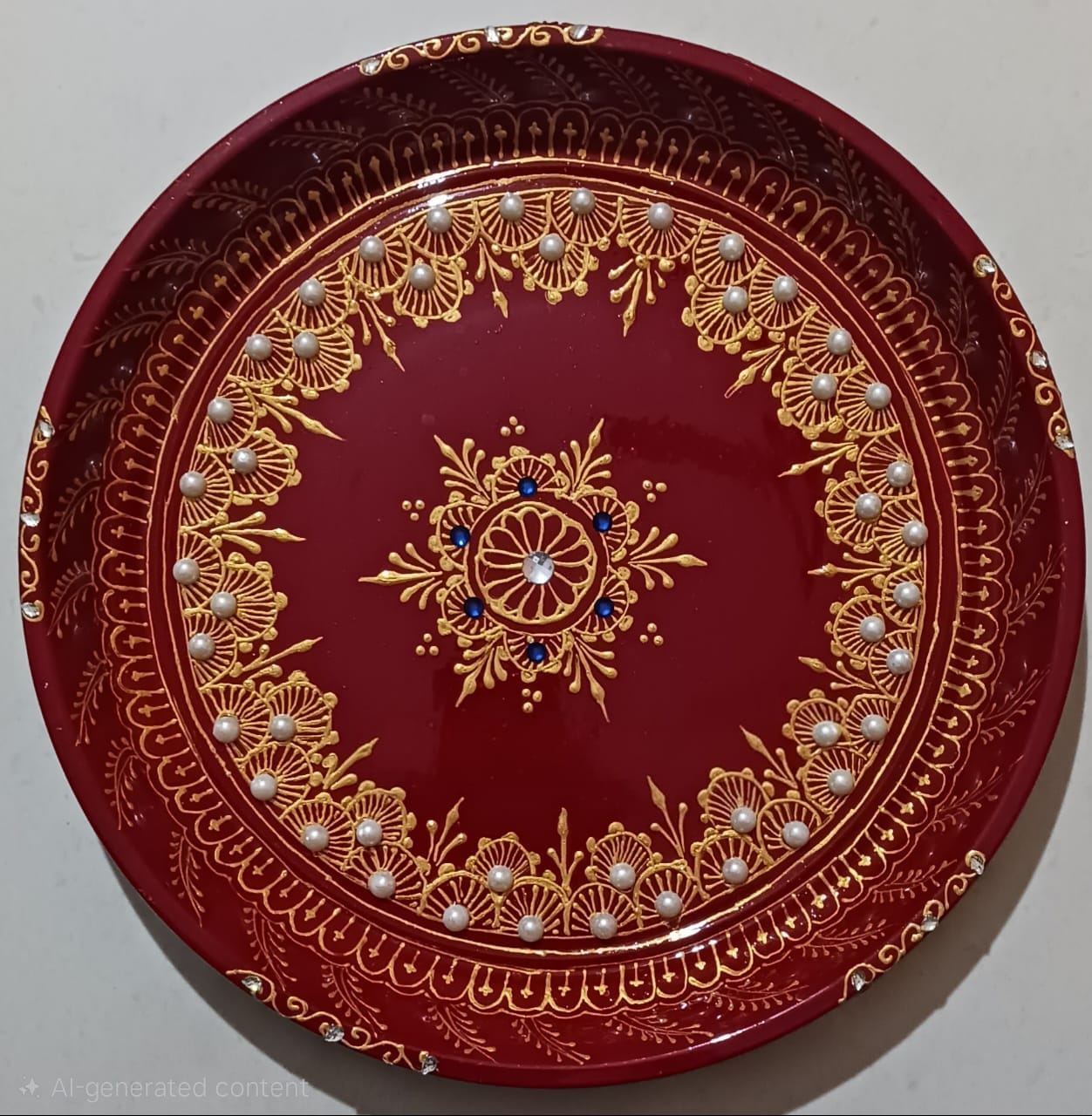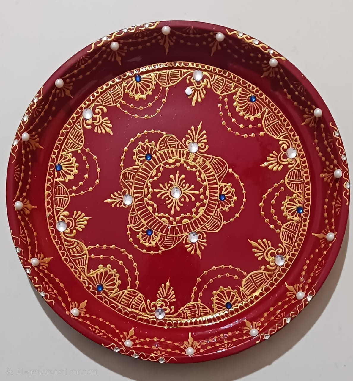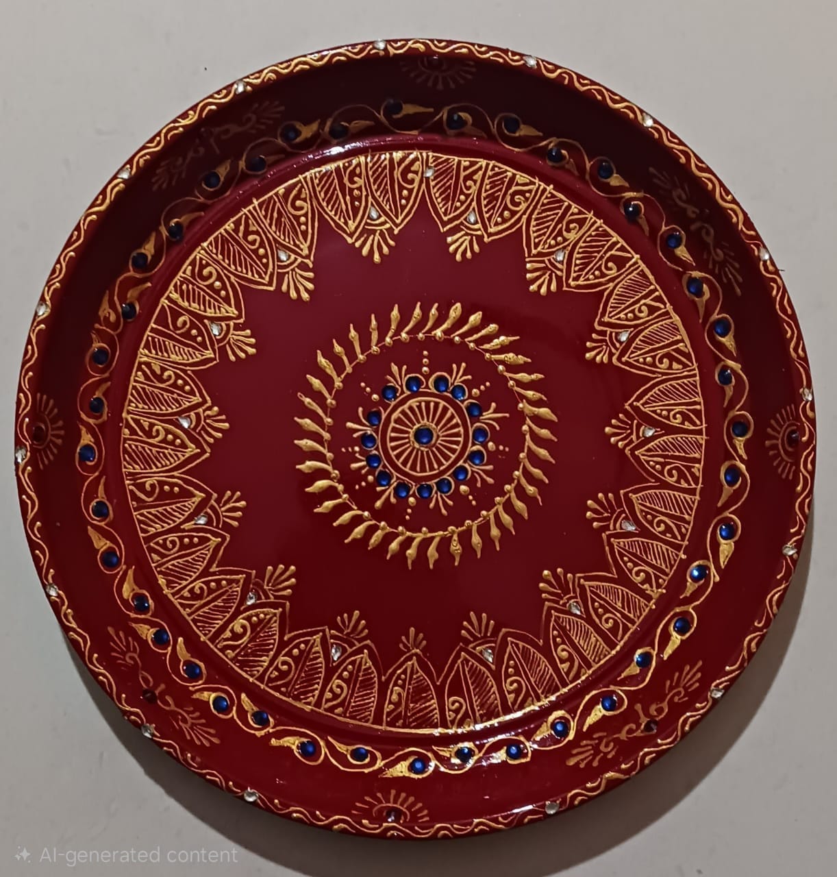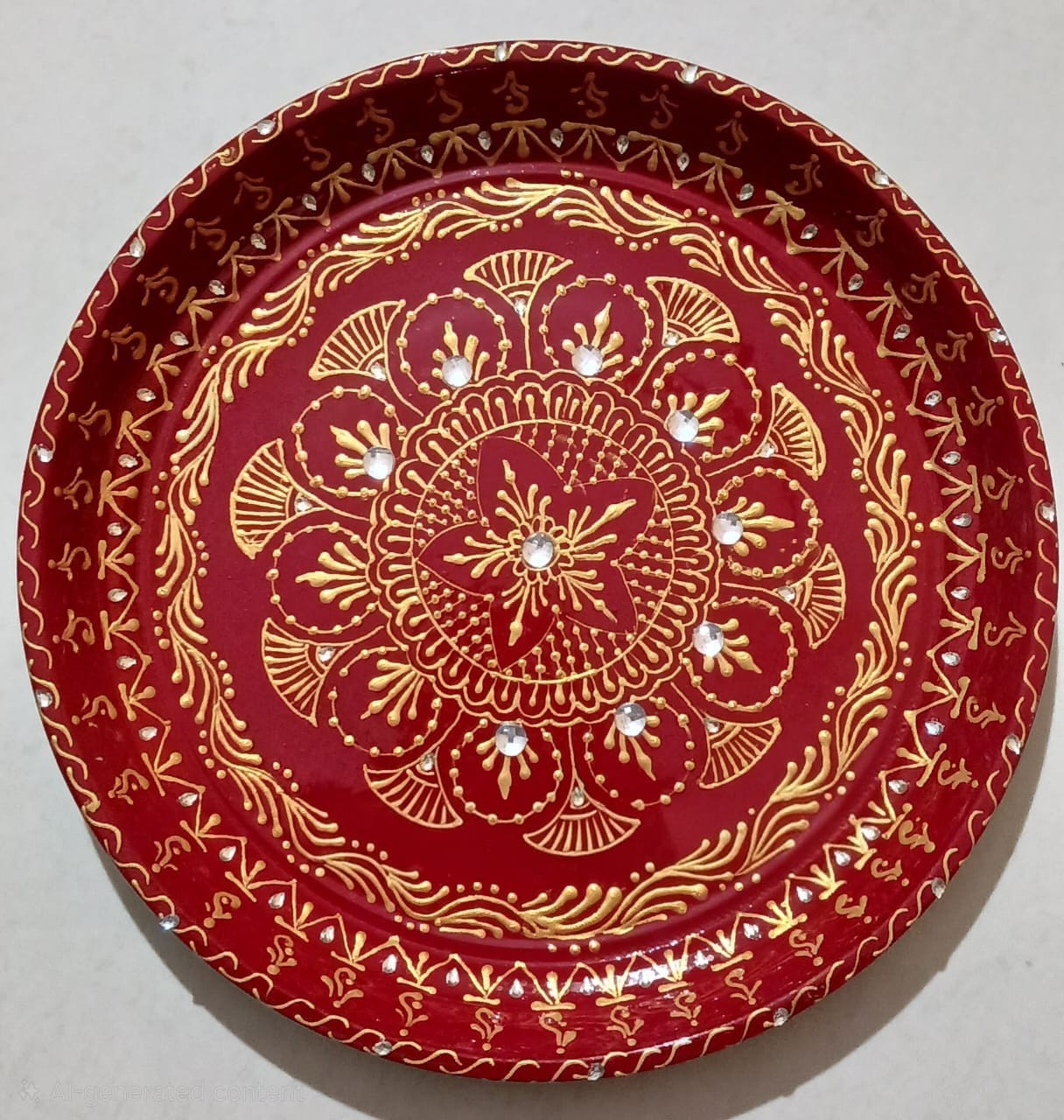 Inspired by classic Rajwadi and temple motifs, these decorative thalis are perfect for pooja rituals, festive ceremonies, weddings, and cultural celebrations. The detailed floral and mandala patterns reflect heritage craftsmanship while the glossy finish adds a luxurious touch. Every piece is carefully finished to ensure durability and reusability, making it suitable for both daily pooja use and special occasions.