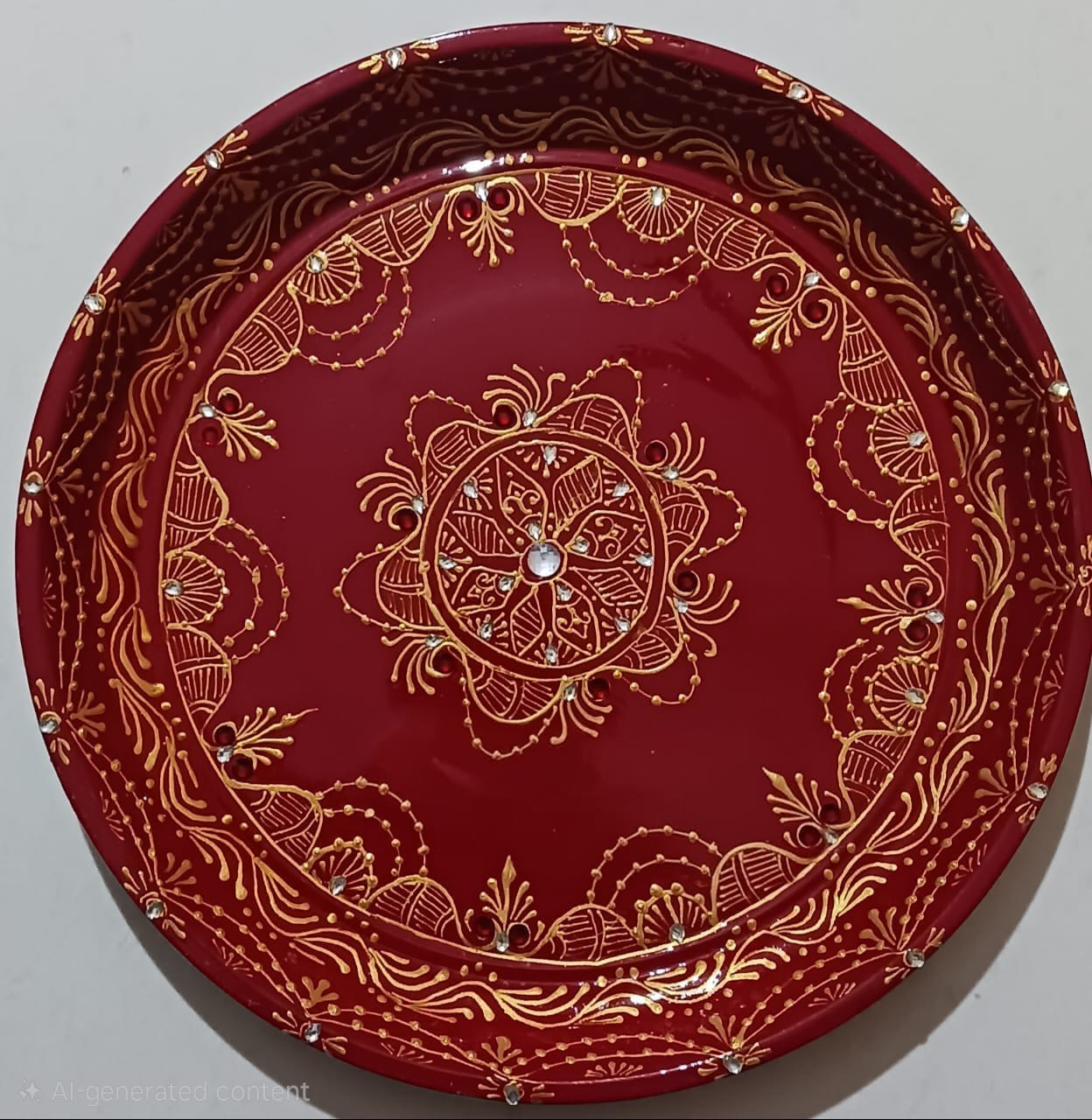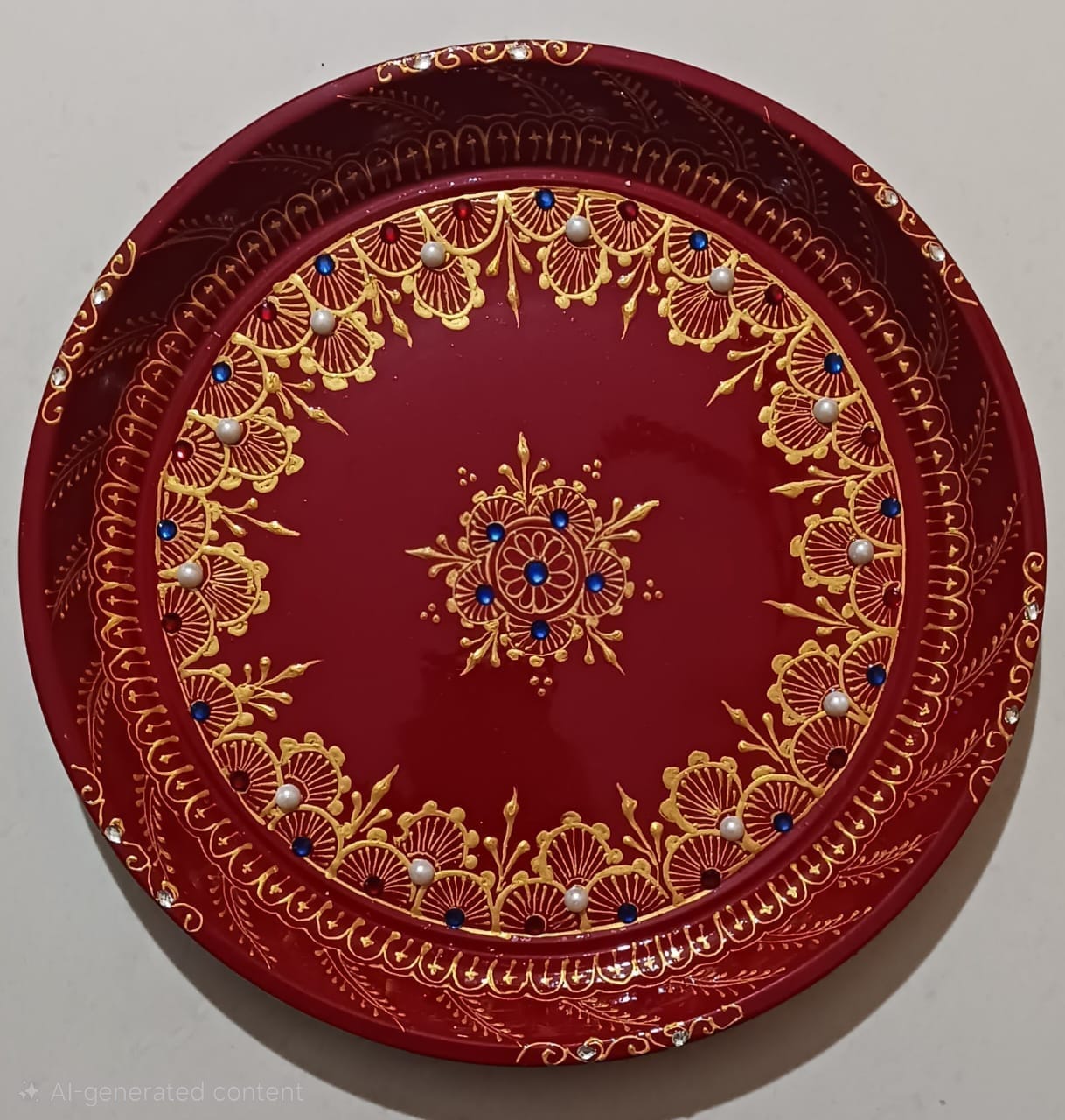 The KalāSangam – Royal Hand-Painted Festive Thali Collection is a celebration of traditional Indian artistry and festive elegance. Each thali in this collection is meticulously handcrafted and hand-painted by skilled artisans, featuring a rich red base enhanced with intricate golden artwork. The designs are further adorned with kundan stones, pearls, and crystal embellishments, creating a royal and auspicious appearance.