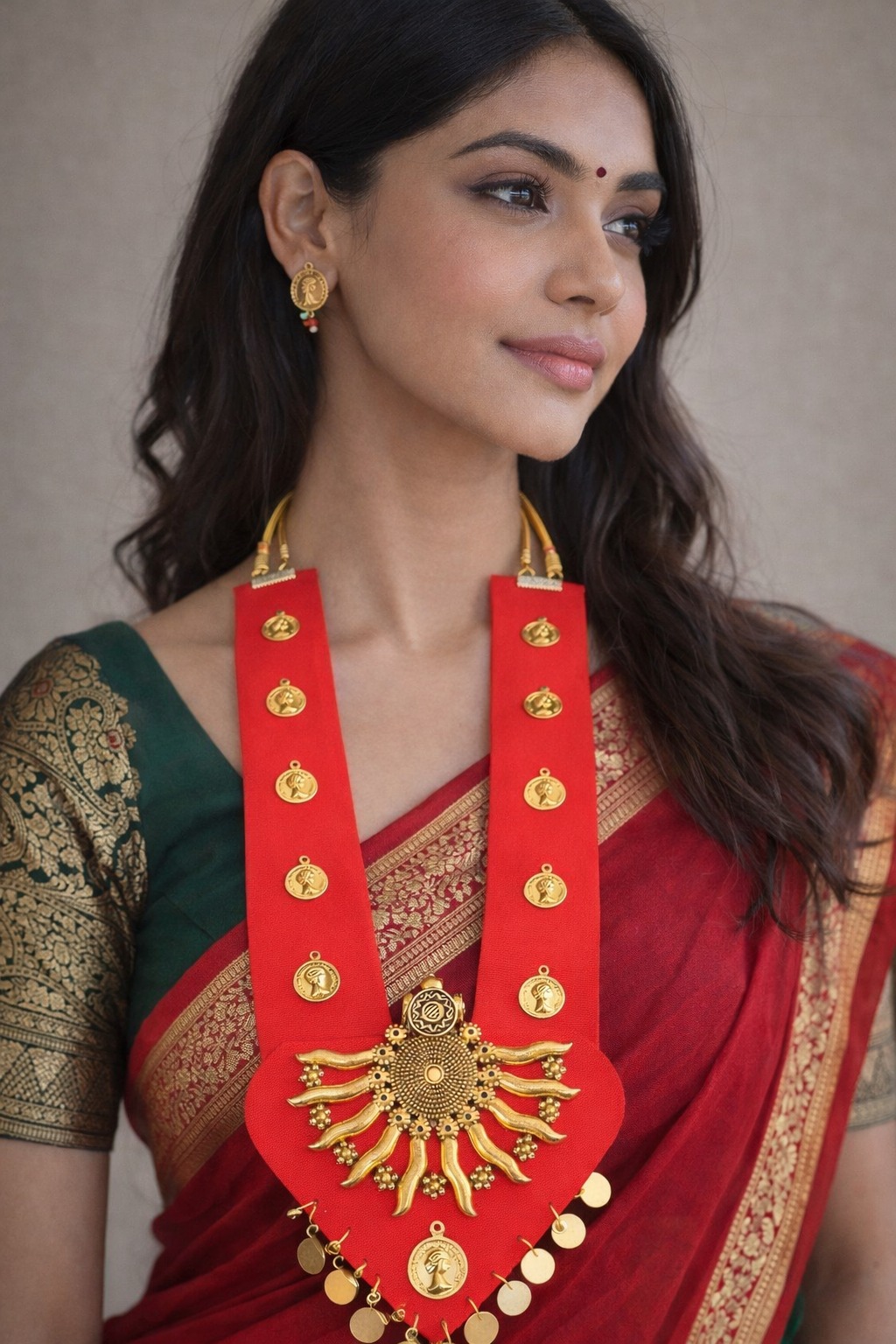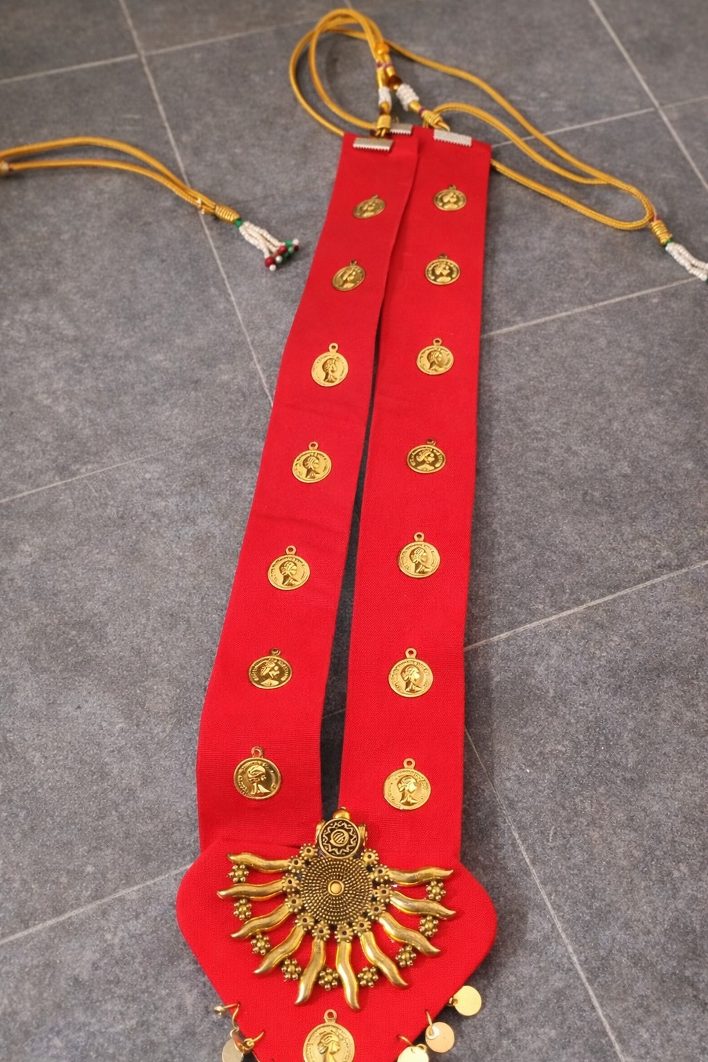 This Red Golden Work Handmade Necklace is a stunning expression of traditional Indian craftsmanship. Crafted on a vibrant red fabric base, the necklace features intricate golden coin detailing and a beautifully designed central sun-inspired pendant that adds royal elegance and cultural charm.
