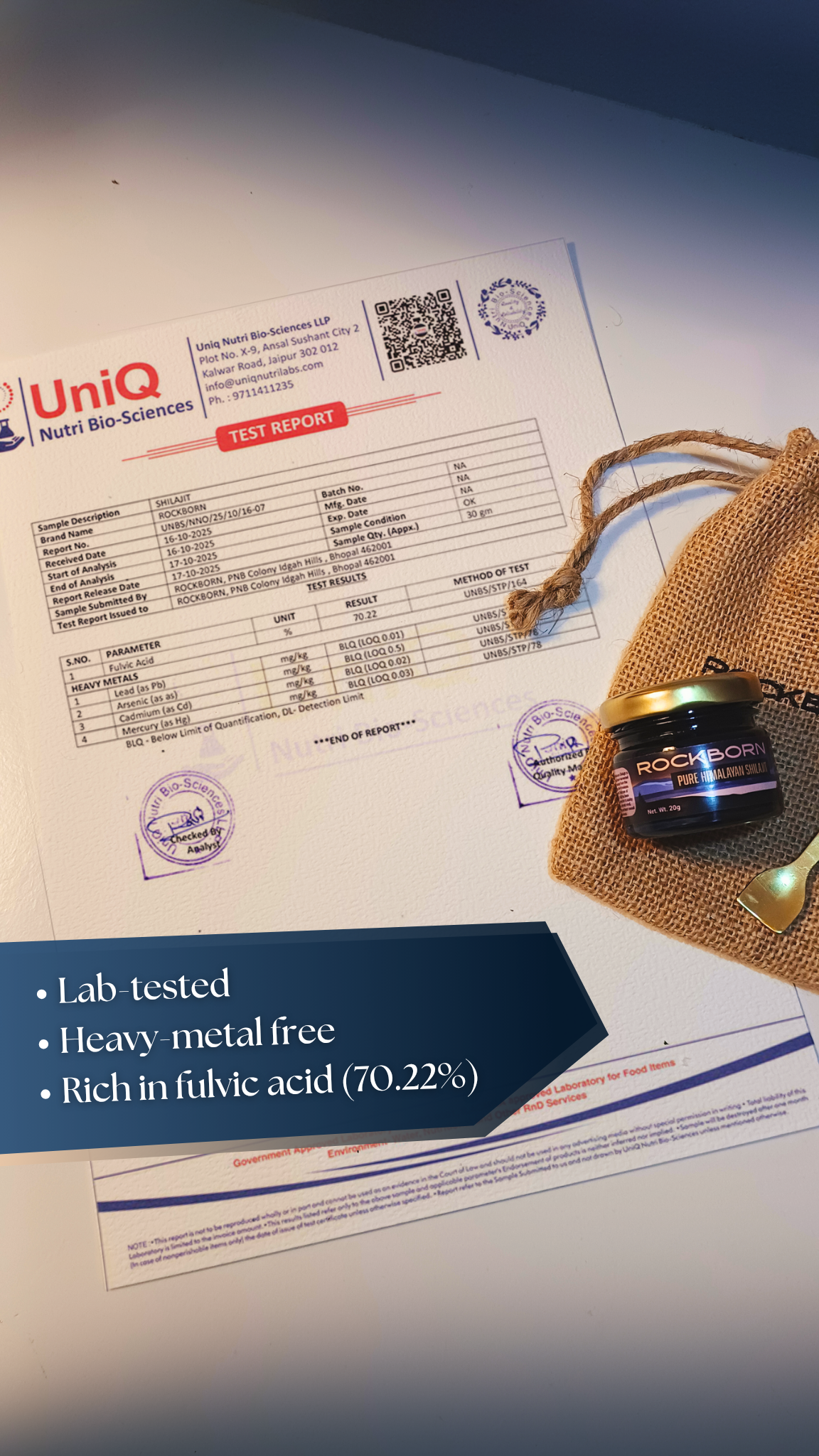 Every batch of Rockborn Shilajit is lab-tested for heavy metals and authenticity.