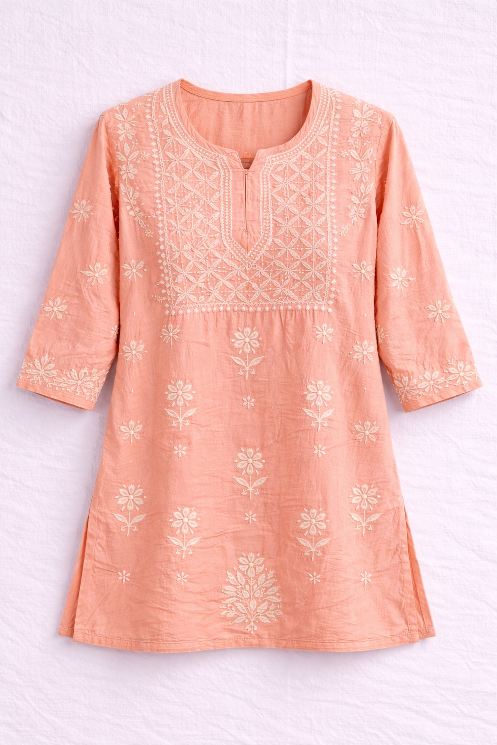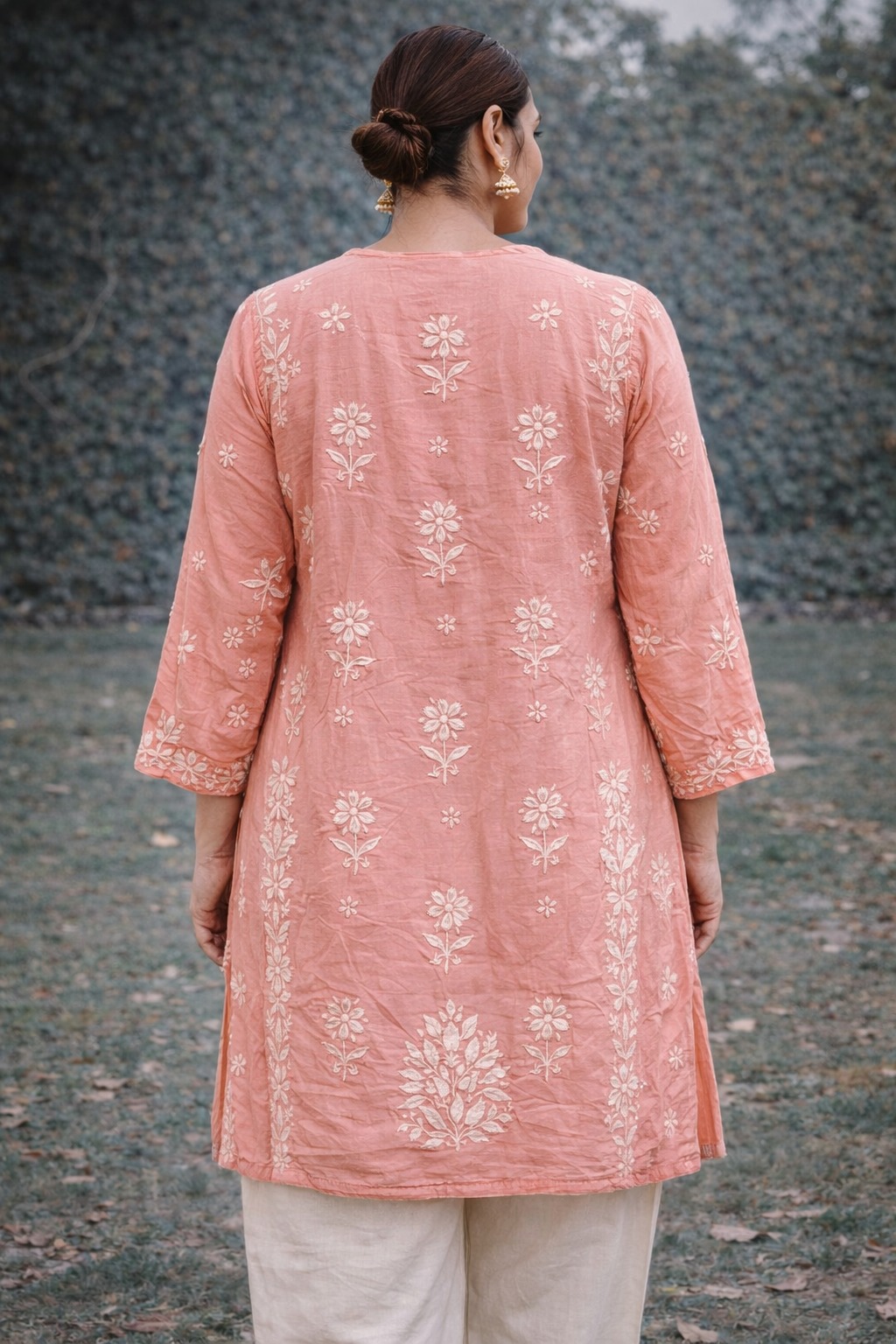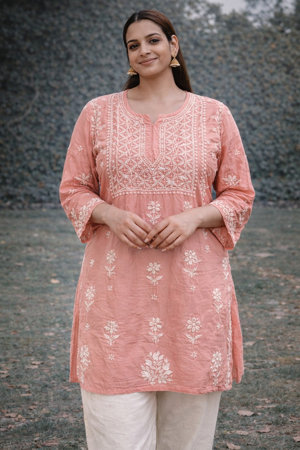 Soft Tale Peach Pink Chikankari Masline top with elegant hand embroidery, paired with comfortable pants. Perfect for daily wear, office, and casual ethnic looks.