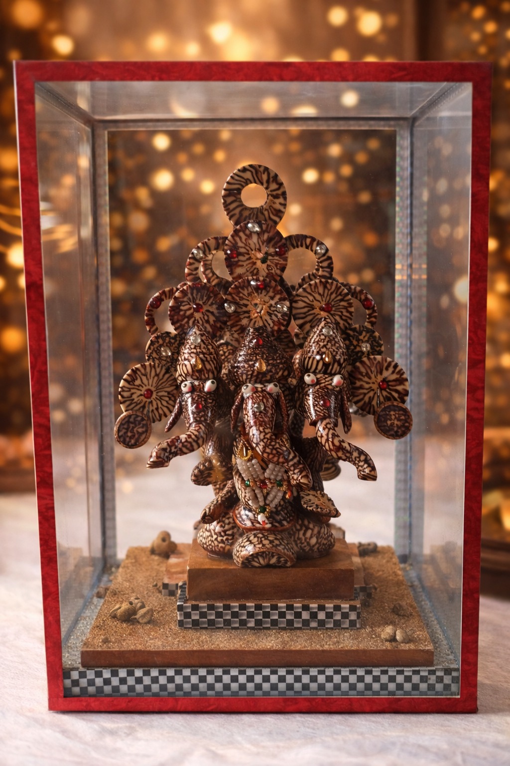 A divine handcrafted Teen Mukhi Ganesh Ji idol made from natural Supadi (Areca Nut), symbolizing protection, wisdom, and balance of past–present–future. Ideal for home mandir, office, and spiritual gifting.