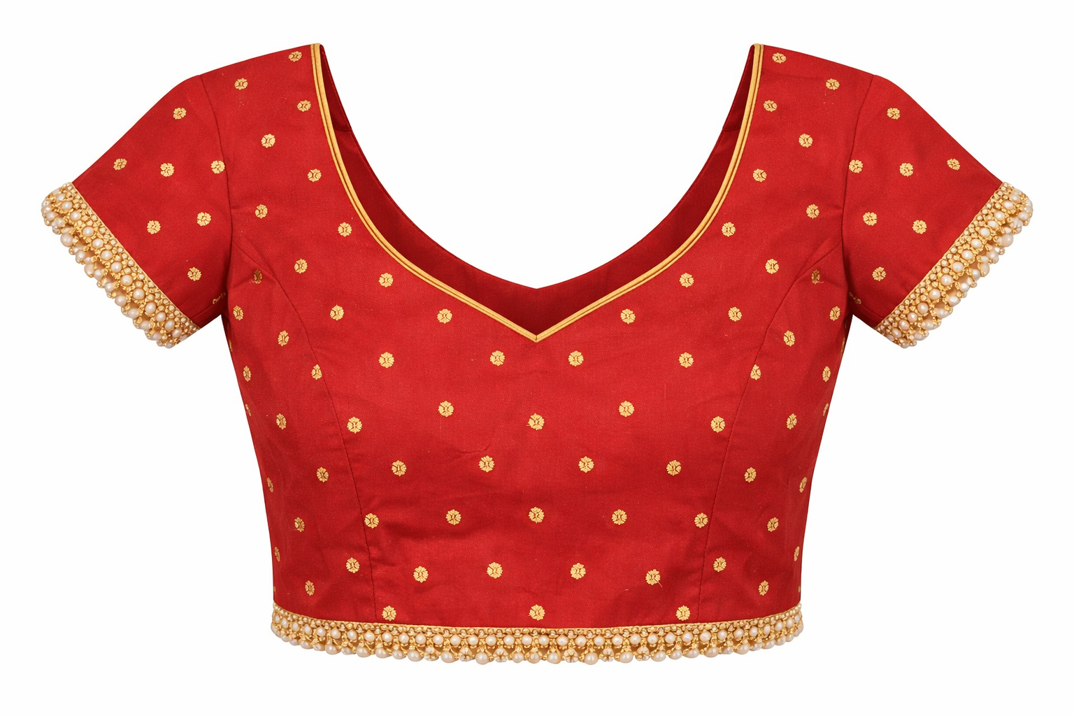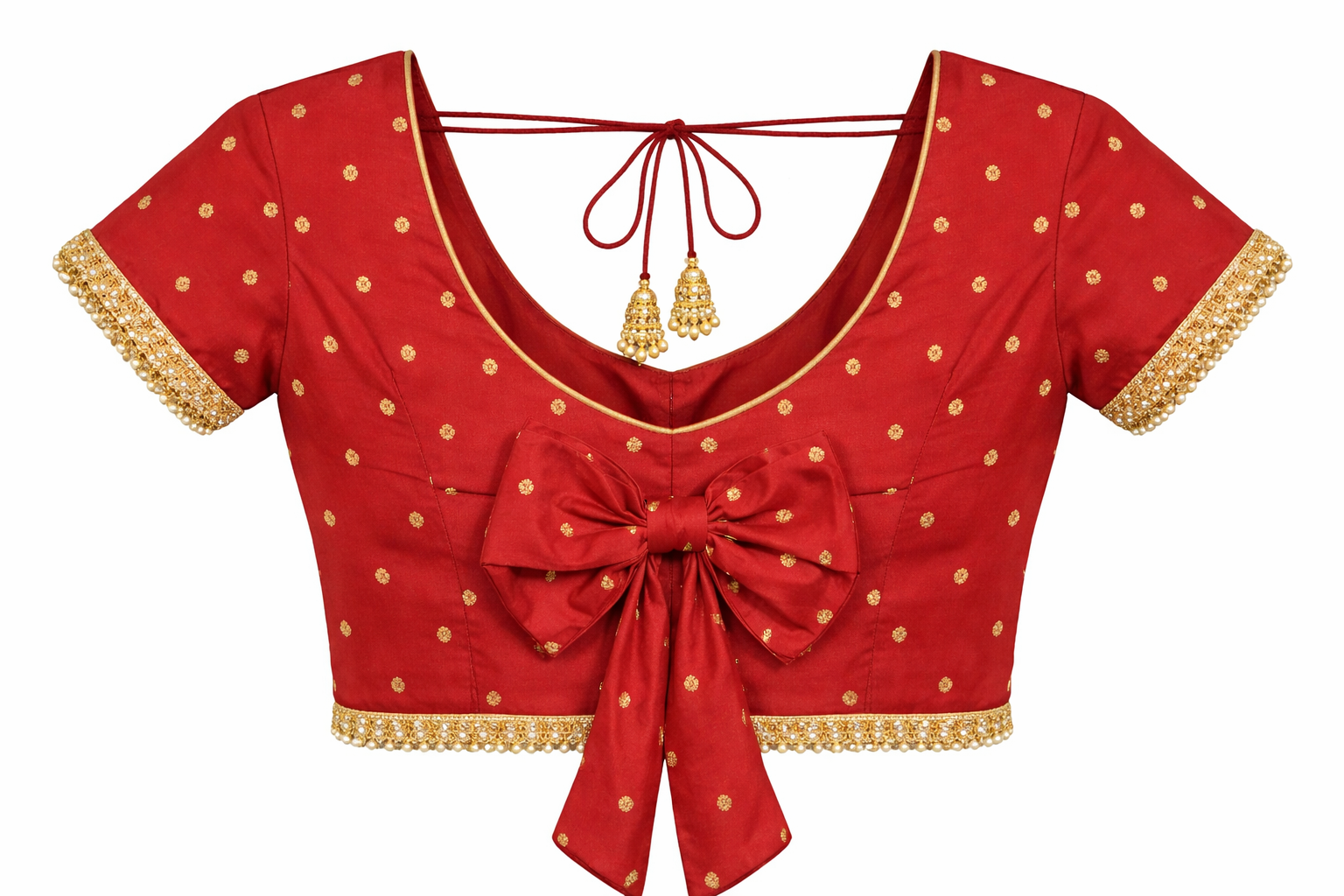 Add elegance to your ethnic wardrobe with this Katori Style Front Hook Designer Blouse from Gunjan Boutique. Crafted from premium fabric with delicate golden polka motifs, this blouse features a beautifully structured katori cut for excellent shape and support. The front hook closure ensures comfort and ease, while the decorative bow at the back enhances its festive appeal. Finished with contrast piping and pom detailing, this blouse pairs perfectly with sarees and lehengas for weddings, festivals, and special occasions.