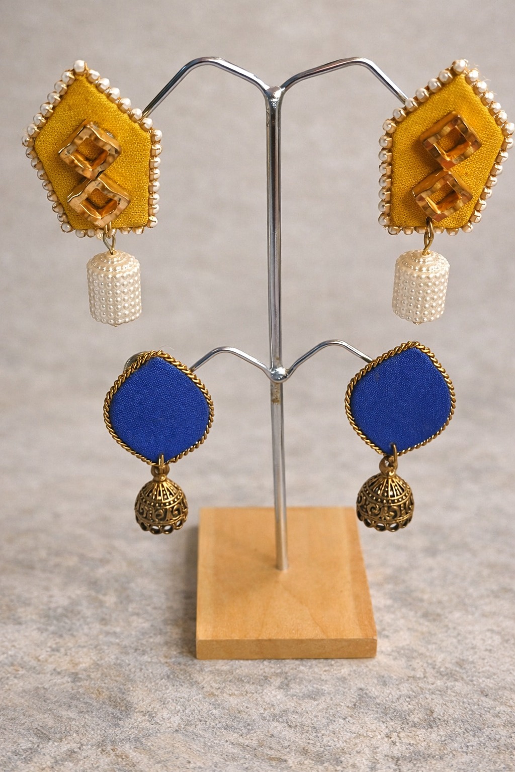 Beautiful handmade yellow and blue earrings crafted with fabric base and traditional detailing.